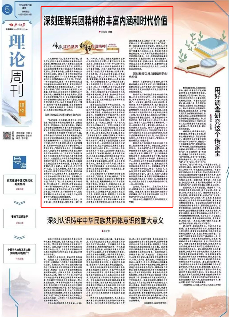 人无精神则不立,国无精神则不强。用大历史观的长焦镜头透视和理解精神的形成逻辑,精神既是过去的人或事在历史长河演进中在人们意识中的历史积淀,亦是历史记忆在现代情境中被不断激发和唤醒的呈现形态,具有承接传统、支撑现实和通达未来的强大功效。质言之,精神作为意识形态的基础因素,赋予了一个国家和民族不断延续和壮大的情感基础和动力支撑。可以说,一部兵团发展史,就是一部不断传承红色基因和赓续红色血脉的演进史,更是中国共产党人精神谱系在新疆的生动写照。习近平总书记强调:“兵团人铸就的热爱祖国、无私奉献、艰苦创业、开拓进取的兵团精神,是中国共产党人精神谱系的重要组成部分,要用好这些宝贵财富。”因此,系统挖掘和深刻揭示兵团精神的本质内涵及其时代价值,有利于坚定理想信念,有利于厚植爱国主义情怀,更有利于培养爱国爱疆、担当奉献的社会主义建设者和接班人,为新时代强国建设、民族复兴固本强基、凝心聚力。
